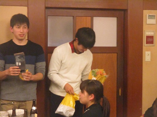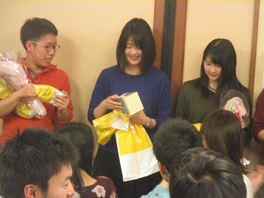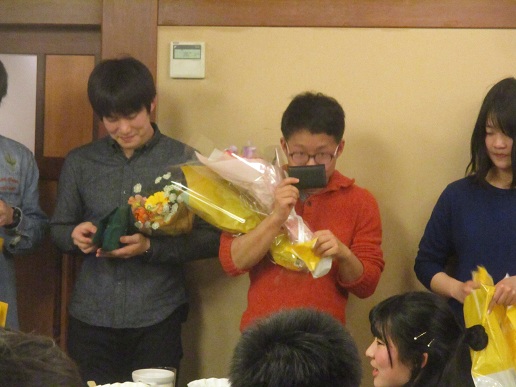 プレゼントと花束を渡す様子。